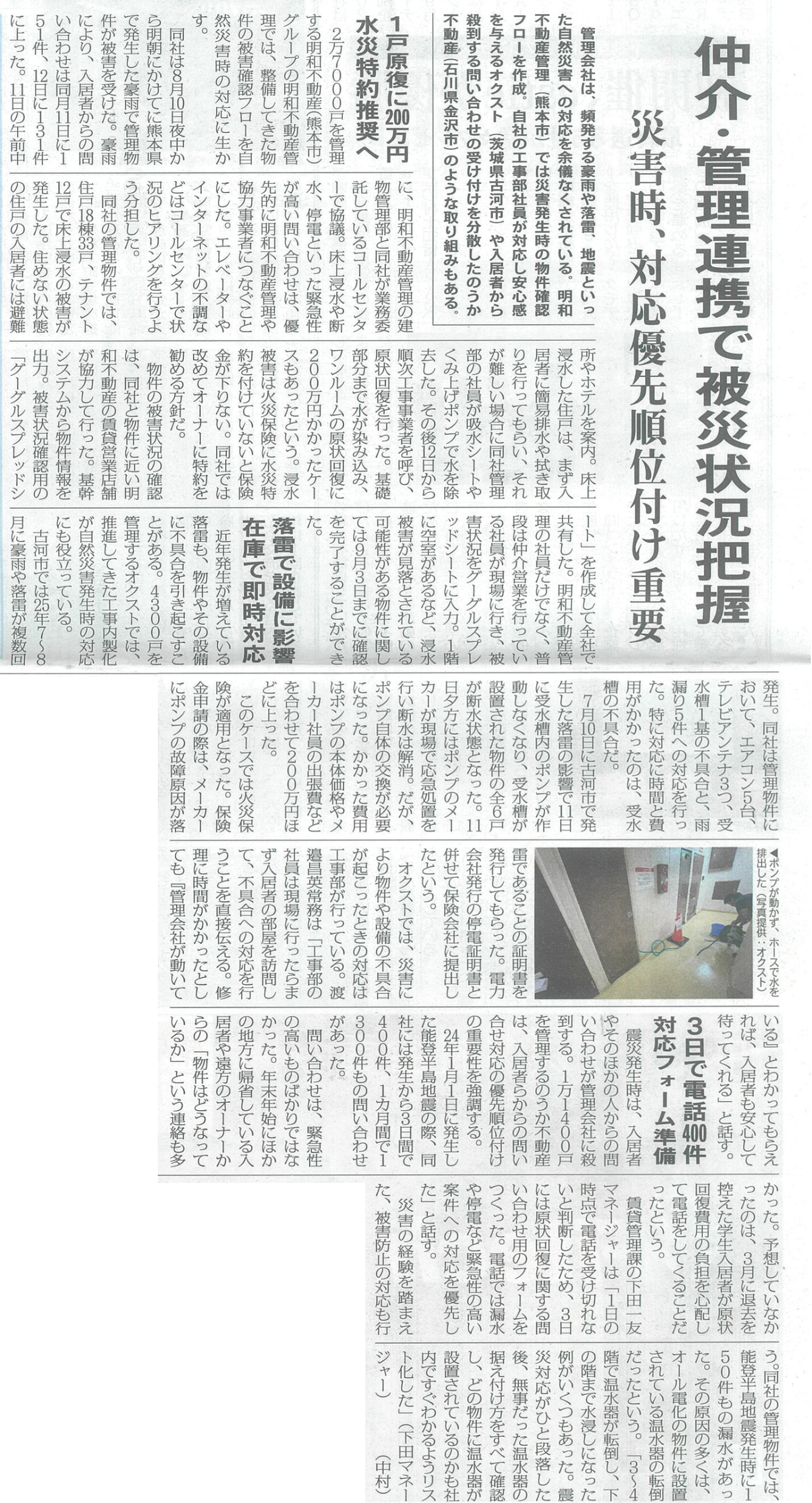 NEWS最新情報 「全国賃貸住宅新聞」にて記事にしていただきました。【災害時の対応】 2025.10.06|メディア掲載 2025年10月6日付けの「全国賃貸住宅新聞」にて、弊社の取り組みについて記事にしていただきました。誠にありがとうございました。 <PREV カテゴリー お知らせ プレスリリース メディア掲載 賃貸 イベント オーナーさま向けセミナー アーカイブ 2025 2024 2023 2022 2021 2020 2019 2018 2017 2016