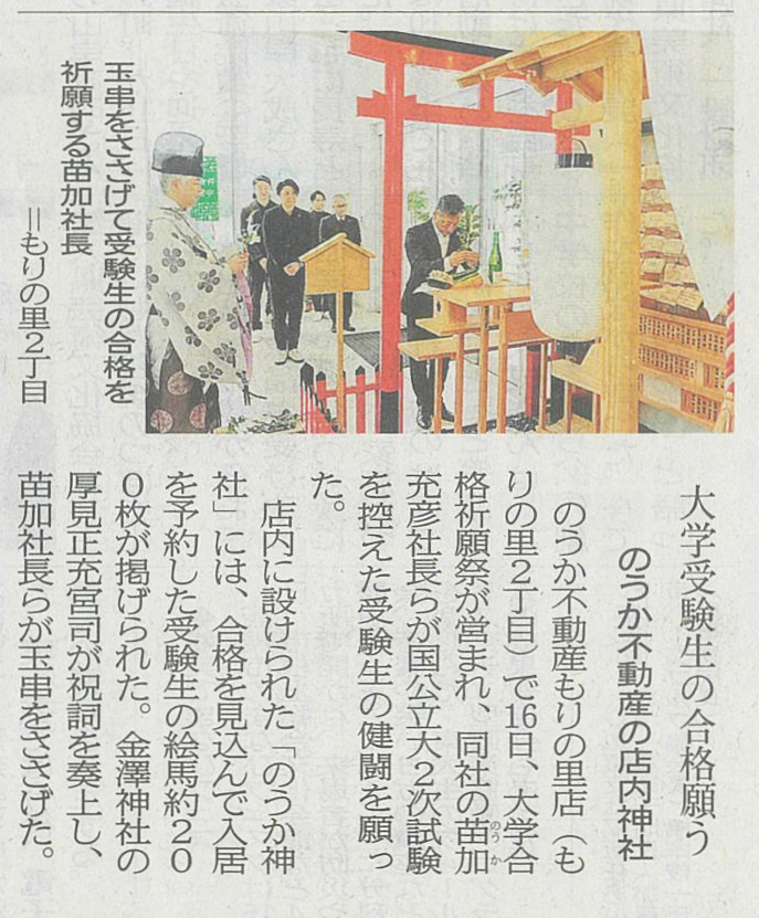 NEWS最新情報 「北國新聞」にて記事にしていただきました。【合格祈願のご祈祷】 2026.02.17|メディア掲載 2026年2月17日付けの「北國新聞」朝刊地域面にて、のうか神社でのご祈祷のようすを記事にしていただきました。誠にありがとうございました。合格発表前予約をしてくださった受験生全員の合格を、こころよりお祈りいたします。 <PREV カテゴリー お知らせ プレスリリース メディア掲載 賃貸 イベント オーナーさま向けセミナー アーカイブ 2026 2025 2024 2023 2022 2021 2020 2019 2018 2017 2016